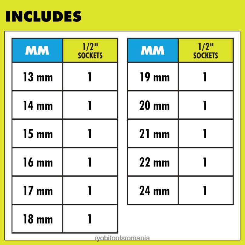 completați-vă soluțiile de conducere cu ryobi 11 pc. set de prize de impact metric de 1/2″. acest set are un design în 6 puncte pentru un cuplu maxim fără elemente de fixare rotunjite. Marcajele de dimensiuni mari permit identificarea rapidă și ușoară, economisind timp la proiect. peretele subțire, designul puțului adânc oferă acces mai bun în spațiile înguste. rămâi organizat cu carcasa compatibilă de stocare pe perete Link. Completați-vă colecția de unelte cu accesorii ryobi. Setul de 11 bucăți de prize metrice de 1/2″ este susținut de garanția limitată pe viață ryobi și include (1 ) carcasă și (11) mufe de 1/2″: 13 mm, 14 mm, 15 mm, 16 mm, 17 mm, 18 mm, 19 mm, 20 mm, 21 mm, 22 mm, 24 mm