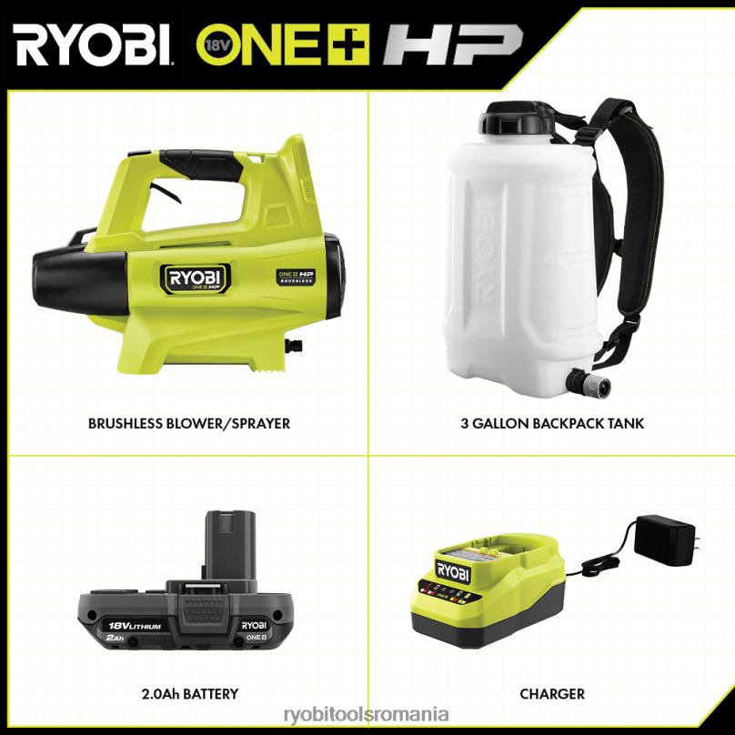 - pulverizare până la 28 de galoane per încărcare cu ventilatorul oprit sau 5 galoane per încărcare cu ventilatorul pornit cu o baterie ryobi 18v one+ 2ah
