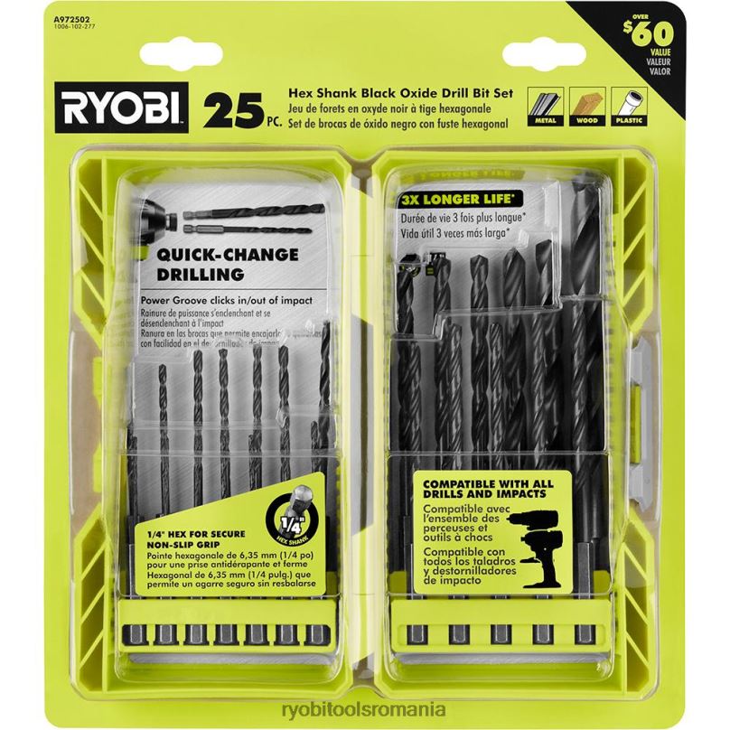 ryobi introduce setul de burghie cu tijă hexagonală din oxid negru din 25 de piese. acest sortiment de burghii este perfect pentru o varietate de materiale, inclusiv suprafete din lemn, metal si plastic. Bițile sunt construite din oțel de mare viteză cu un finisaj oxid negru pentru a oferi durabilitate superioară și o durată de viață de 3 ori mai mare. O altă caracteristică a acestor burghii este punctul de despicare la 135 de grade pentru a găuri la contact și pentru a preveni mersul bitului. designul hexagonal de 1/4″ asigură o prindere sigură în mandrina de foraj pentru a preveni alunecarea burghiului. Designul hexagonal de 1/4″ asigură îndepărtarea ușoară a burghiului pentru schimbări rapide între burghie și burghie de antrenare. carcasa compactă pentru acces ușor la biți și mobilitate. acest sortiment larg, variind de la 1/16″ la 1/2″, garantand un pic pentru toate nevoile proiectului dumneavoastra. acest set includes (3) burghie din oxid negru de 1/16″, (2) burghie din oxid negru de 5/64″, (2) burghie din oxid negru de 3/32″, (2) burghie din oxid negru de 7/64″, ( 3) burghiu din oxid negru de 1/8″, (1) burghiu din oxid negru de 9/64″, (1) burghiu din oxid negru de 5/32″, (1) burghiu din oxid negru de 11/64″, (2) Burghiu din oxid negru de 3/16″, (1) burghiu din oxid negru de 7/32″, (1) burghiu din oxid negru de 15/64″, (2) burghiu din oxid negru de 1/4″, (1) 5/ Burghie din oxid negru de 16″ și (1) burghie din oxid negru de 3/8″.