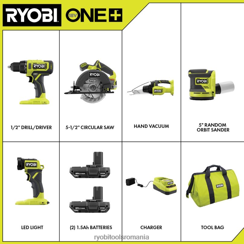 intra in sistemul ryobi 18v one+ cu setul combinat ryobi 18v one+ cu 5 scule – burghiu/machita de 1/2″, fierastrau circular de 5-1/2″, aspirator manual, aleatoriu șlefuitor orbital, lumină LED, (2) baterii cu litiu de 1,5 Ah, încărcător și geantă pentru scule. burghiul / șoferul oferă până la 515 in-lbs. de cuplu și dispune de o mandră metalică cu clichet de 1/2″ pentru a se potrivi nevoilor dvs. de găurire și antrenare. ferăstrăul circular de 5-1/2″ are capacitatea de a tăia material de 2 ori, cu peste 215 tăieturi per încărcare. aspiratorul puternic al aspiratorului de mână curăță o varietate de resturi uscate și suprafețe și este capabil de accesorii de 1-1/4 inch. șlefuitorul orbital aleatoriu creează un finisaj neted, fără vârtej, cu 10.000 opm. Acest instrument are, de asemenea, fixare cu cârlig și buclă pentru o fixare rapidă. atașament de șmirghel și colectare de praf la bord pentru o curățare ușoară, lumina cu LED are, de asemenea, 280 de lumeni de putere luminoasă și has un cap pivotant la 130 de grade pentru direcția reglabilă a fasciculului de lumină. bateriile cu litiu 18v one+ 1.5ah dispun de un indicator de combustibil integrat de înaltă vizibilitate pentru a monitoriza timpul de funcționare rămas. încărcătorul de 18v este compatibil cu bateriile cu litiu ryobi one+. acest kit combinat 18v one+ 5 instrumente este susținut de garanția producătorului ryobi de 3 ani și include (1) pcl206 18v one+ 1/2″ burghiu/șurubelniță, (1) pcl500 18v one+ 5-1/2″ ferăstrău circular, ( 1) pcl705 18v one+ aspirator manual, (1) pcl406 18v one+ șlefuitor orbital aleatoriu, (1) pcl660 18v one+ led lampă, (2) baterii cu litiu 18v one+ 1.5ah, (1) pcg002 18v one+încărcător, filtru circular, aspirator lamă de ferăstrău, sortiment de șmirghel, geantă de scule și manuale de utilizare.
