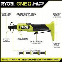 îmbunătățiți-vă sistemul ryobi 18v one+ cu clichetul compact fără perii de 1/4″ de mare viteză de 18v one+ hp. one+ hp tehnologia oferă mai multă putere, timp de funcționare, durabilitate și viteză utilizând motoare fără perii, electronice avansate și tehnologie cu litiu de înaltă performanță. Uneltele noastre compacte sunt cele mai ușoare și mai mici pe care le-am făcut vreodată, oferind totuși putere optimă pentru a face treaba. ideale pentru orice mașină Entuziast sau tehnician profesionist, acest clichet este capabil de o viteză de 2 ori mai mare, oferind până la 460 rpm. Perechea care, cu un cuplu de 40 ft-lbs., această unealtă devine cea mai mare economie de timp atunci când se realizează sarcini repetitive, ceea ce duce la finalizarea mai rapidă a proiectului. Cap de clichet rotativ cu 20% mai compact, cu 4 poziții, cu LED dublu integrat cuorklights, acest clichet poate ajunge la orice piuliță sau șurub dintr-un spațiu de lucru iluminat. declanșatorul cu paletă din metal cu viteză variabilă este ușor accesibil dintr-o varietate de mânere și unghiuri. declanșatorul cu paletă din metal cu viteză variabilă este ușor accesibil dintr-o varietate de mânere și unghiuri. acest clichet compact fără perii de 1/4″ de mare viteză de 18v one+ hp este susținut de garanția producătorului ryobi de 3 ani și include (1) clichet compact fără perii de 1/4″ de mare viteză și manualul de utilizare psbrc02. Cel mai bun dintre toate, face parte din sistemul ryobi 18v one+ de peste 280 de produse fără fir care funcționează toate pe aceeași platformă de baterie. baterie de 2 Ah și încărcător incluse.