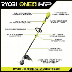 mașina de tuns cu atașament fără perii de 15″ ryobi 18v one+ hp este cea mai bună combinație de putere și versatilitate are un motor fără perii pentru putere și durabilitate maximă.Capacitatea de atașament expand-it vă permite să vă transformați mașina de tuns într-o mașină de tuns, suflantă, ferăstrău cu stâlp și multe alte instrumente cu atașamentele disponibile, ceea ce înseamnă că puteți economisi timp, spațiu și bani. acest trimmer este echipat cu cap de alimentare cu mulinetă easy+ cu manivelă viteză care poate fi reîncărcat în 60 de secunde sau mai puțin. declanșatorul cu viteză variabilă și comutatorul cu 2 viteze oferă un control sporit pentru orice aplicație. reglabilul de la 13″ la 15 ” lățimea de tăiere vă permite să optimizați mașina de tuns pentru a creștetimp de rulare sau o lățime de tăiere mai mare. acest design ușor și bine echilibrat are și un mâner frontal pentru confort, iar mașina de tuns este echipată cu o baterie de 6,0 ah pentru o durată de funcționare extinsă. bateria este compatibilă cu sistemul ryobi one+. susținut de o garanție de 3 ani.