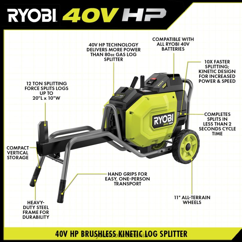 intra in sistemul ryobi 40v cu kitul ryobi 40v hp brushless kinetic splitter bușteni. Tehnologia de 40 V CP oferă 12 tone de forță de despicare cu mai multă putere decât un despicator de bușteni pe gaz de 80 cc, ceea ce face din acesta un adevărat înlocuitor de gaz. Tehnologia de 40 V CP combină un motor fără perii, o electronică avansată și tehnologia cu litiu de înaltă performanță pentru a oferi mai multă putere, o durată mai lungă de funcționare și o durabilitate mai mare. acest despicator de busteni are puterea de a despica lemne de esenta tare precum stejarul alb, stejarul rosu si hickory. economisiți timp cu designul cinetic, care oferă un timp de ciclu rapid de 2 secunde și o divizare de 10 ori mai rapidă. cu 150 de rupturi per încărcare, acest despicator cinetic de bușteni este perfect pentru despicarea copacilor tăiați sau căzuți în bucăți mai mici de lemn de foc. Transportați cu ușurință despicatorul de bușteni cinetic prin curtea dvs. cu comânere confortabile și roți pentru toate terenurile. cadrul de oțel rezistent poate face față chiar și celor mai dificile terenuri și se depozitează pe verticală când lucrarea este terminată. cel mai bun dintre toate, face parte din sistemul ryobi 40v în care orice baterie de 40v funcționează cu orice produs de 40v. acest kit ryobi 40v hp de despicat de bușteni cinetic fără perii este susținut de garanția de 5 ani a instrumentului ryobi a producătorului, 3 ani de garanție a bateriei de la producător și include despicator de bușteni fără perii ry40704 40v hp, baterie op40404 40v 40v 40v 40v lithium, încărcare op404 teacă/capac, roți, feronerie și manuale de utilizare.