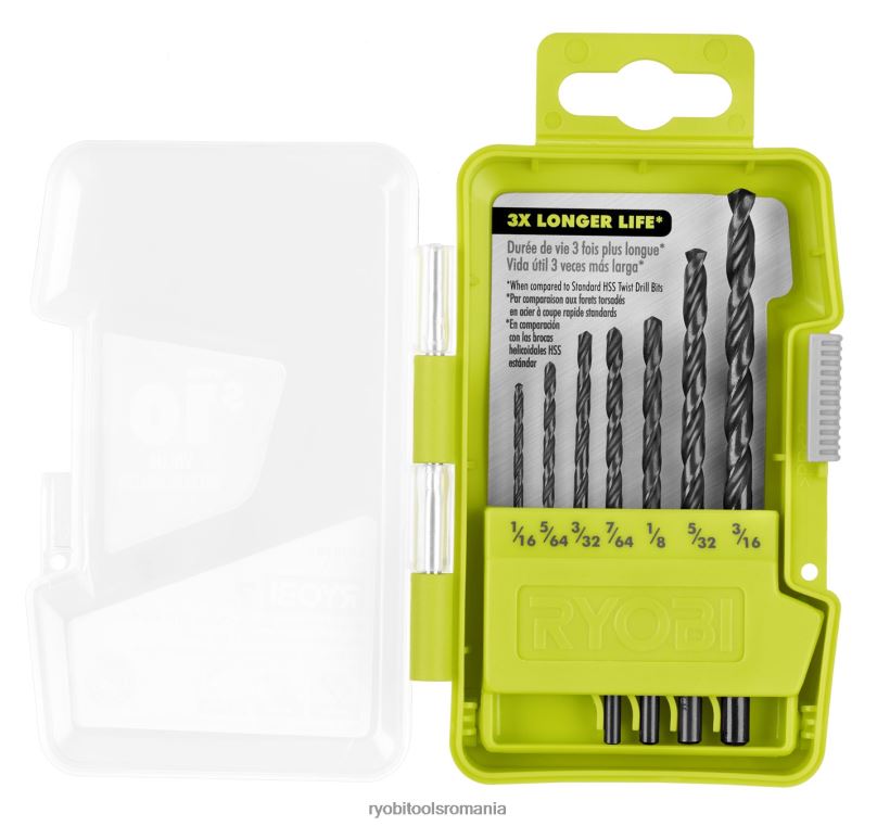 ryobi introduce setul de burghie din oxid negru cu tijă rotundă din 7 piese. acest sortiment de burghie este perfect pentru materiale precum lemn, metal și suprafețe din plastic. aceasta este o soluție compactă perfectă pentru proiectele dvs. din jurul casei. Bițile sunt construite din oțel de mare viteză cu un finisaj oxid negru pentru a oferi durabilitate superioară și o durată de viață de 3 ori mai mare. O altă caracteristică a acestor burghii este punctul de despicare la 135 de grade pentru a găuri la contact și pentru a preveni mersul bitului. capacul transparent al carcasei oferă vizibilitate pentru un acces mai ușor. acest sortiment include bucăți variind de la 1/16″ la 3/16″ pentru toate nevoile dvs. de bricolaj. acest set include (1) burghie din oxid negru de 1/16″, (1) burghie din oxid negru de 5/64″, (1) burghie din oxid negru de 3/32″, (1) burghie din oxid negru de 7/64″ , (1) 1/8″ oxid negruburghie, (1) burghie din oxid negru de 5/32 inchi, (1) burghie din oxid negru de 3/16 inchi.