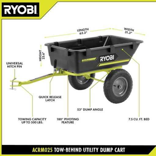 căruciorul de basculantă utilitar cu remorcare ryobi cu cârlig universal oferă transport și remorcare versatil pentru utilizarea de zi cu zi. atașați acest cărucior de basculantă utilitar la o mașină de tuns iarbă, o mașină de tuns zero sau un tractor de gazon pentru a transporta cu ușurință încărcăturile pe proprietatea dumneavoastră. cu o capacitate de remorcare de până la 500 lbs și un pat de 7,5 ft^3, transportați ușor mulci, pământ, plante, pietre, lemn de foc, unelte de grădină și multe altele. economisiți timp cu funcția de pivotare la 180 de grade, care vă permite să vă aruncați comod și precis în stânga, dreapta sau spatele mașinii dvs. de tuns tuns parcate. acest cărucior utilitar de basculantă este conceput pentru a face față celor mai dificile lucrări, cu un cadru durabil din oțel și anvelope pneumatice pentru toate terenurile de 16 inchi. Goliți cu ușurință căruciorul utilitar de basculantă cu baza pivotantă de 180 de grade, unghi de descărcare de 53 de grade și dispozitiv de blocare cu eliberare rapidă. știftul universal de cuplare se potrivește majorității călărieimașini de tuns iarba, mașini de tuns iarba și tractoare de gazon. personalizați-vă căruciorul de gunoi utilitar cu fantele integrate de extensie a stâlpilor care vă permit să vă construiți propriile panouri laterale și separatoare. acest cărucior de basculant utilitar cu remorcare în spate, cu cârlig universal, include cadrul de oțel, coșul de gunoi, prelungirea tubului metalic, cârligul metalic, osia, anvelopele, hardware-ul de asamblare și manualul de utilizare.