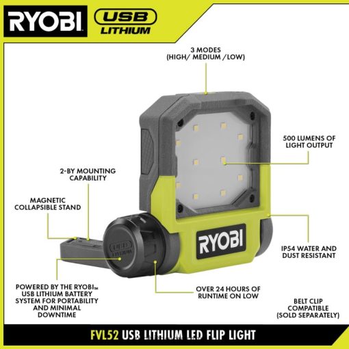 ryobi introduce setul de lumini flip cu led cu litiu usb. această lumină oferă 500 de lumeni și are 3 moduri de lumină pentru a oferi cantitatea ideală de lumină necesară de fiecare dată. montați și direcționați-vă lumina exact acolo unde aveți nevoie, cu suportul pivotant, baza magnetică și capacitatea de montare 2-by. această lumină oferă peste 24 de ore de acoperire clară. cu un rating ip54 pentru rezistență la apă și praf, această lumină este construită pentru a rezista chiar și în cele mai dure condiții. setul de lumină cu LED-uri USB cu litiu este o parte a sistemului de litiu USB care oferă soluții compacte, portabile și reîncărcabile pentru putere și productivitate fără fir. acest kit de lumină cu led cu litiu USB este susținut de garanția producătorului ryobi de 2 ani și include (1) lampă cu led fvl52, (1) baterie litiu litiu 2ah fvb01, cablu USB și manuale de utilizare. vezi mai multe