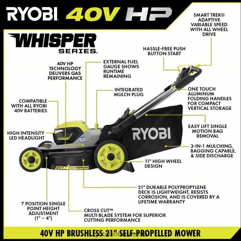 introducerea mașinii de tuns iarba ryobi 40v hp brushless 21” awd. Tehnologia de 40 V CP oferă mai multă putere decât o mașină de tuns gazon de 170 cc, făcând din această mașină un adevărat înlocuitor de gaz. este ideal pentru până la acri cu porturi active duble pentru baterie și funcționează până la 70 de minute cu (2) baterii de 40 V 6 Ah incluse. această mașină de tuns tuns tunsoare dispune de sistemul de tăiere transversală cu mai multe lame, care oferă o tăietură superioară cu tăieturi mai fine care elimină aglomerarea, permite o dispersie mai mare și mai uniformă la descărcarea laterală și pungi mai eficient decât concurența, astfel încât nu trebuie să încetați să cosiți pentru goliți sacul la fel de des. motorul fără perii și electronica avansată reacționează automat la condițiile de cosire prin creșterea vitezei lamei pentru a elimina îmbolnăvirea și puterea prin cea mai grea tăietură. ca parte a seriei șoapte,această mașină de tuns iarbă este cu 85% mai silențioasă decât pe gaz și chiar mai silențioasă decât alte mașini de tuns tuns cu acumulator, permițându-vă să tundeți în orice moment al zilei fără a deranja pe alții. sistemul de tracțiune integrală vă oferă manevrabilitate și control suprem pe orice teren, oferind putere maximă tuturor celor patru roți, în timp ce tehnologia smart trek autopropulsată vă permite să adaptați cu ușurință viteza mașinii de tuns iarbă la ritmul dumneavoastră, cu mai puțină oboseală. selectați rapid înălțimea perfectă pentru gazonul dvs., variind de la 1 inch până la 4 inch cu reglarea înălțimii în 7 poziții într-un singur punct. când lucrarea este terminată, îndepărtarea ușoară a sacului de ridicare vă permite să goliți rapid sacul de iarbă fără a vărsa iarba tăiată, iar mânerele pliabile cu o singură atingere se prăbușesc rapid și ușor pentru depozitare compactă și verticală chiar și în locuri înguste. faceți referire la indicatorul de combustibil de la bord pentru durata de funcționare rămasă, iar cu încărcătorul rapid de 40 V inclus, bateriile se reîncarcă în mai puțin de 60 de minute. treceți rapid de la ambalare la mulci prin simpla tragere a unei pârghii cu mulc integrath mufa. designul roții înalte de 11 inchi vă permite să virați mai ușor și oferă o tracțiune generală și o manevrabilitate mai bună. placa compozită durabilă de 21 inchi este ușoară, rezistă la coroziune și este acoperită de o garanție limitată pe viață. această mașină de tuns iarbă are faruri cu LED-uri de mare intensitate, care vă permit să cosiți în zori sau în amurg. cel mai bun dintre toate, face parte din sistemul de 40v – orice baterie de 40v funcționează cu orice produs de 40v. această mașină de tuns iarba fără perii de 40 V CP de 21 inchi este susținută de garanția de 5 ani a producătorului pentru scule și de 3 ani de garanție a bateriei a producătorului. include mașină de tuns iarba fără perii ry401201 40v hp 21” awd, (2) baterii cu litiu op40605 40v 6ah, încărcător rapid op406 40v, sac pentru iarba, cheia de pornire, jgheabul de descărcare laterală și manuale de utilizare.