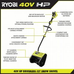 Preluați controlul în această iarnă cu lopata de zăpadă fără perii de 12″ fără perii ryobi 40v hp. Tehnologia ryobi 40v hp oferă o putere de neegalat pentru a curăța o cale de 12″, alimentând zăpada de 6″ adâncime. aruncați cu ușurință zăpada la 25″ Calea de 12″ fără zăpadă. Designul compact și ușor vă permite să curățați trotuarele, aleile și punțile cu mai puțină oboseală. Capacitatea de atașare vă permite să adăugați atașamente ryobi expand-it, economisind timp, bani și spațiu. Cuplaj de blocare/deblocare la 180 de grade pentru a atașa alte instrumente capabile de atașare, cum ar fi suflantul ryobi, mașina de tăiat, ferăstrăul cu stâlp și multe altele. Comutatorul cu 2 viteze asociat cu un declanșator cu viteză variabilă vă oferă control maxim de curățare și putere atunci când aveți cea mai mare nevoie. cu o baterie de 40 V 4 Ah și un încărcător de 40 V, utilizați aceeași baterie pe orice alt instrument Ryobi de 40 V.Lopata de zăpadă fără perii bi 40v hp de 12 inchi este susținută de o garanție limitată de 5 ani și o garanție limitată de 3 ani pentru baterie.