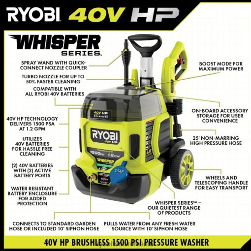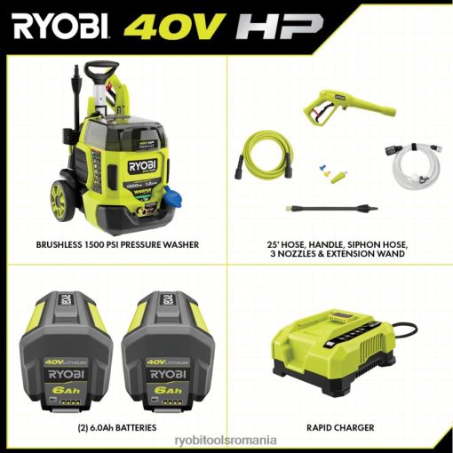 îmbunătățiți-vă sistemul de 40v cu mașina de spălat cu presiune ryobi 40v CP. Tehnologia avansată de 40 V CP utilizează un motor fără perii, electronice avansate și baterie cu litiu pentru a furniza până la 1.500 psi și 1,2 gpm pentru o curățare puternică și portabilă. fără gaz, fără întreținere și fără bătăi de cap. pentru o durată maximă de funcționare, utilizați această mașină de spălat cu presiune la setarea implicită pentru performanță de 1000 psi. atunci când este nevoie de putere maximă, dezlănțuiți 1.500 psi în modul boost. motorul fără perii și tehnologia cu litiu asigură până la 25 de minute de funcționare cu (2) baterii incluse de 40 V 6 Ah. această mașină de spălat cu presiune din seria Whisper este proiectată pentru a fi cu 81% mai silențioasă decât mașinile de spălat cu presiune pe gaz, permițându-vă să curățați în orice moment al zilei fără a deranja pe alții. îmbunătățiți-vă mașina de spălat cu presiune cu soluția de curățare a suprafețelor ry31012vnm 12″ fsau curățare rapidă, fără urme, mătură de apă ry31211 pentru îndepărtarea eficientă a murdăriei și a resturilor și blasterul cu spumă ry31f04 pentru distribuirea controlată a detergentului cu spumă. cel mai bun dintre toate, face parte din sistemul ryobi 40v în care orice baterie de 40v funcționează cu orice produs de 40v. această mașină de spălat cu presiune de 40 V CP este susținută de garanția producătorului ryobi de 5 ani, iar bateriile incluse sunt acoperite de garanția de 3 ani a producătorului pentru baterii. această mașină de spălat cu presiune include mașina de spălat cu presiune ry40pw15 40v, (2) baterii cu litiu op40605 40v 6ah, mâner de declanșare, baghetă de pulverizare, furtun de înaltă presiune de 25 de picioare, furtun de sifon de 10 pi, duze (15 grade, săpun și turbo), adaptor de autoamorsare și manuale de utilizare.
